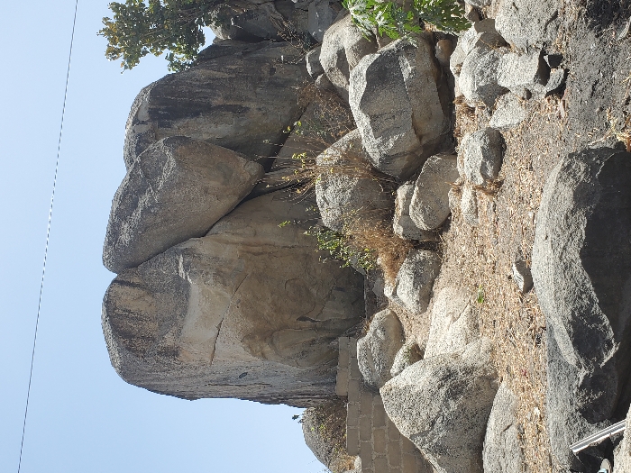 The image displays a natural rock formation located in Mangu Town, Nigeria, under a clear, bright blue sky with a faint, horizontal utility wire visible overhead. The central and upper portions of the scene are dominated by a massive cluster of weathered, grey-brown granite boulders, exhibiting rounded forms and visible fissures. Several smaller, irregularly shaped grey boulders are scattered across the foreground and mid-ground, forming an uneven, rocky slope. The ground between the rocks is covered with dry, light brown soil, small pebbles, and sparse, withered grasses and plant debris. Patches of green leafy vegetation from small bushes or trees are visible among the rocks, particularly on the right side of the frame. On the far left, a section of a low wall constructed from light-colored concrete blocks is partially visible at the base of the largest rock formation. A reflective metallic object is present in the bottom left corner, partially obscured by a dark grey foreground rock. No human or animal subjects are visible in the scene.
