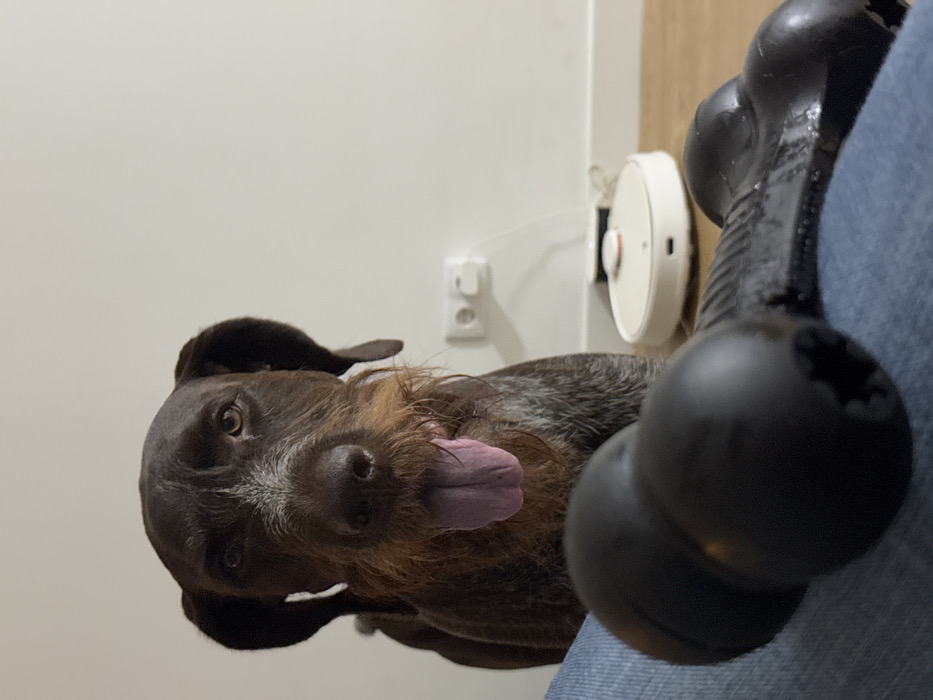 - "An indoor scene in Funchal, Portugal, features a dark brown, medium-sized dog, possibly a German Wirehaired Pointer, with a white blaze on its forehead and reddish-brown facial hair" by FM-8ALHx1, licensed under CC BY 4.0