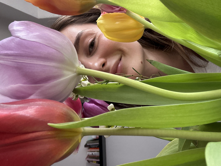 This image captures an indoor scene in Unknown, Unknown. The foreground is dominated by a bouquet of fresh tulips and other greenery. Prominent tulips include a red bloom on the left, a lavender bloom centrally positioned, and a yellow bloom on the right, all featuring vibrant green stems and leaves. Smaller white flowers are interspersed among the tulips. Partially visible behind the flowers is a young adult female's face, positioned slightly to the right of the center. Her right eye, cheek, nose, and upper lip are discernible, with a slight upward curve indicating a soft smile. Her light to medium brown hair is visible on the right side of her face. She appears to be wearing a light-colored garment. The background consists of a plain light grey wall, with a blurred dark shelf holding several small, dark, rectangular objects, identified as books, visible on the far left. No active interactions are depicted.