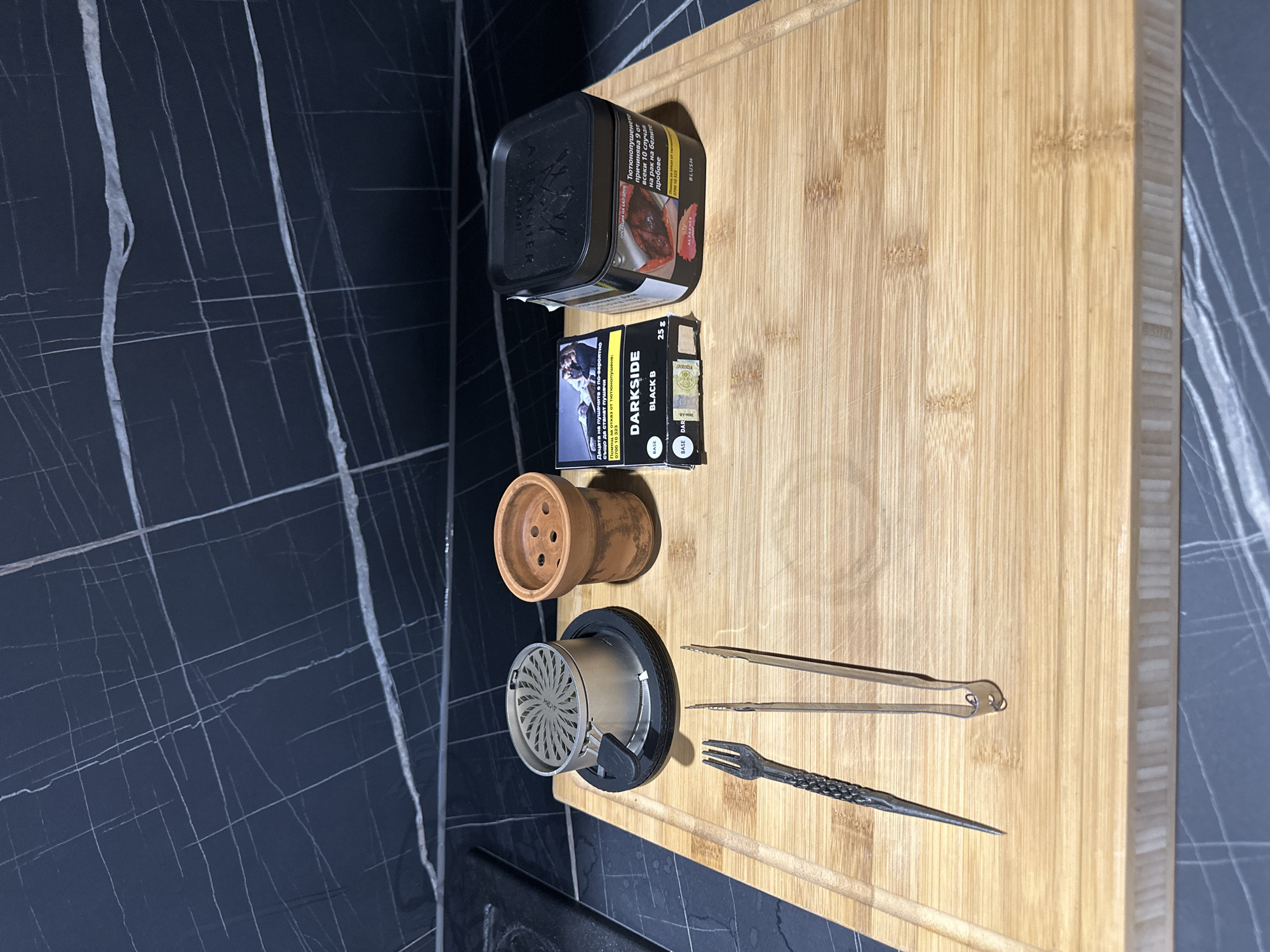 - "collection of hookah-related items arranged on a light-colored wooden cutting board" by FM-QISpK2, licensed under CC BY 4.0