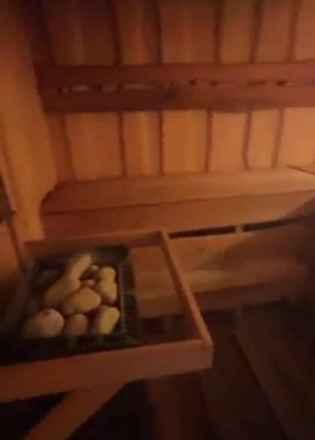 inside of a wooden sauna. The benches are arranged in tiers. In the foreground is a container of light-colored stones. A man with a shirtless torso is reflected in a glass panel in the sauna. The room is lit in orange tones.