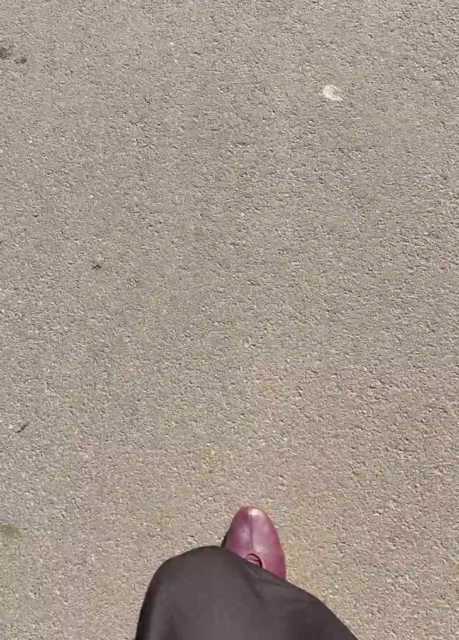 person walking on a sidewalk. The camera is pointed down, initially showing the person's feet, specifically a dark purple laced shoe and the bottom of a black garment, likely pants or a dress. The person walks forward on the grey sidewalk, which is bordered by thin strips of grass on either side. At the end of the sidewalk, there's a road with cars passing by and parked on the side. There's also a signpost visible. The day appears sunny.