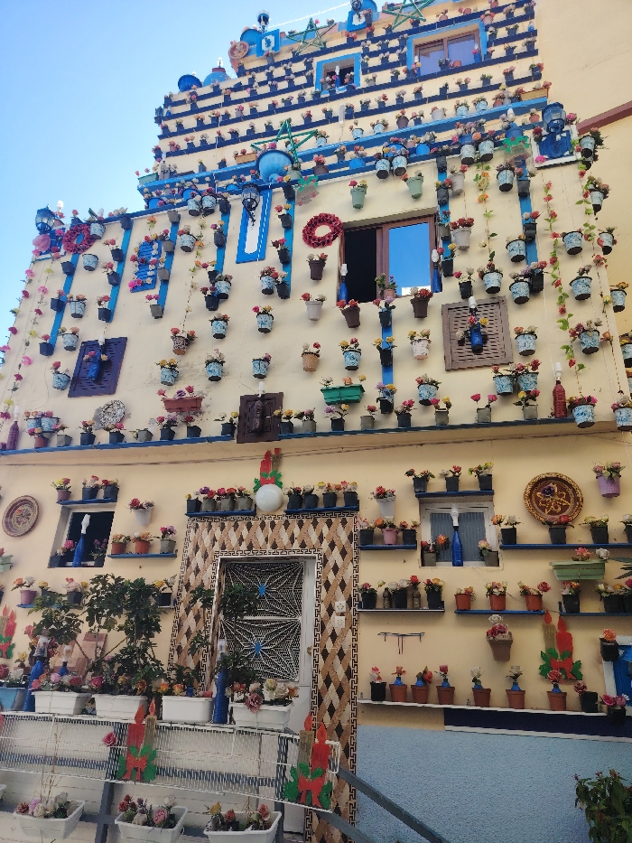The image depicts the heavily decorated facade of a multi-story building located in the city of Tangier, Morocco. The building's exterior is painted in a light cream or beige tone, transitioning to a light blue base at the bottom. The entire visible surface is meticulously covered with thousands of small pots, primarily black or terracotta, each containing artificial flowers in diverse colors such as red, pink, yellow, white, and blue. These flower pots are arranged in dense horizontal and vertical patterns, mounted directly onto the walls, placed on narrow blue shelves, or affixed to vertical blue decorative strips. Prominent architectural features include: - A central ground-floor entrance framed by a geometric pattern of brown and white tiles, leading to a white metal door featuring a blue star-shaped grill design. - Several windows, including a large upper-story window reflecting the clear blue sky, and smaller, sometimes shuttered, windows at lower levels. - The upper sections of the building ascend in a tiered fashion, distinguished by horizontal blue bands and further adorned with numerous small flower pots and various blue ornamental structures and figurines. - Additional decorative elements include circular patterned plates, red and green candle-shaped ornaments, blue hanging lanterns, and garlands of small flowers. - Large white planter boxes containing green foliage and flowers are visible on a ledge to the left of the main entrance. The scene is illuminated by natural daylight under a clear blue sky. No individuals are present in the image, and no actions or interactions are depicted.