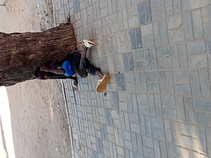 A young male individual is seated outdoors in Dorayi, Nigeria, against the base of a large, dark-barked tree. He is dressed in a dark short-sleeved top and dark trousers. A bright blue plastic object is positioned on his lap. His left hand is raised to the side of his head, while his legs are loosely crossed, revealing a tan sandal on his left foot and a white sandal on his right. He looks directly forward. The individual is situated on a grey paver sidewalk, which gives way to a dusty, unpaved ground surface in the background.
