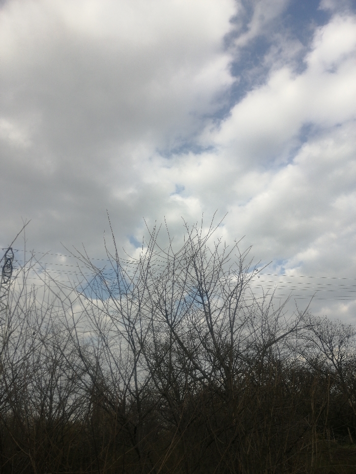 The image displays an outdoor environment in Galabovo, Bulgaria, under a dynamic sky. The upper two-thirds of the frame are occupied by a partially cloudy sky, featuring large formations of white and light grey cumulus clouds interspersed with patches of visible blue sky. The lower third of the image is filled with a dense array of leafless deciduous trees and brush, presenting as dark, intricate networks of bare branches and twigs. On the far left, a portion of a metal lattice transmission tower is visible, extending vertically from behind the tree line. Several parallel electrical power lines traverse the mid-ground horizontally, situated above the tree canopy and below the cloud cover, originating from or connecting to the visible transmission tower. No individuals, animals, or specific activities are present within the captured scene.