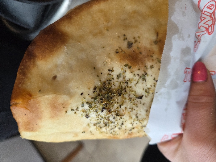 - "A human hand, with fuchsia-painted fingernails, holds a triangular portion of a baked dough product, likely a flatbread or calzone, in Gevgelija, North Macedonia" by FM-RWGJp2, licensed under CC BY 4.0