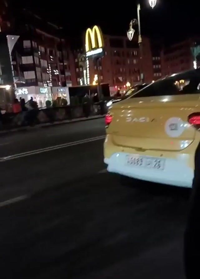 The video was taken at night on a street. There is a yellow taxi driving on the street. In the background, there are buildings and a McDonald's sign. The video is shaky and seems to be taken from a moving vehicle.
