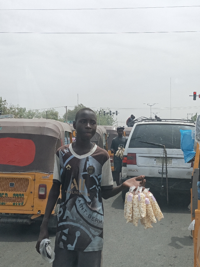 A young male stands centered on a paved road in Hotoro, Nigeria, facing the viewer. He wears a short-sleeved, v-neck t-shirt with brown and light blue geometric patterns, featuring text that includes "SAINT-GERMAIN" and "PSG". In his left hand (viewer's right), he holds a cluster of approximately 10-12 small, clear plastic bags containing a light-colored, granular snack, consistent with popcorn. In his right hand (viewer's left), he holds a small, white plastic bag containing an unidentifiable object. Behind the primary subject, a row of yellow and brown auto-rickshaws are visible on the left side of the frame, appearing to be stationary in traffic. To the right of the primary subject, a light-colored SUV, with "CITROËN" visible on its rear, is also stationary. Another male individual, dressed in dark clothing, is positioned between the primary subject and the SUV, also holding bags of merchandise. A third individual is visible further back on the roof rack of the SUV. The background consists of an overcast sky, distant trees, utility poles, and traffic lights displaying a red signal on the far right. The scene depicts a bustling urban street environment during daylight hours.