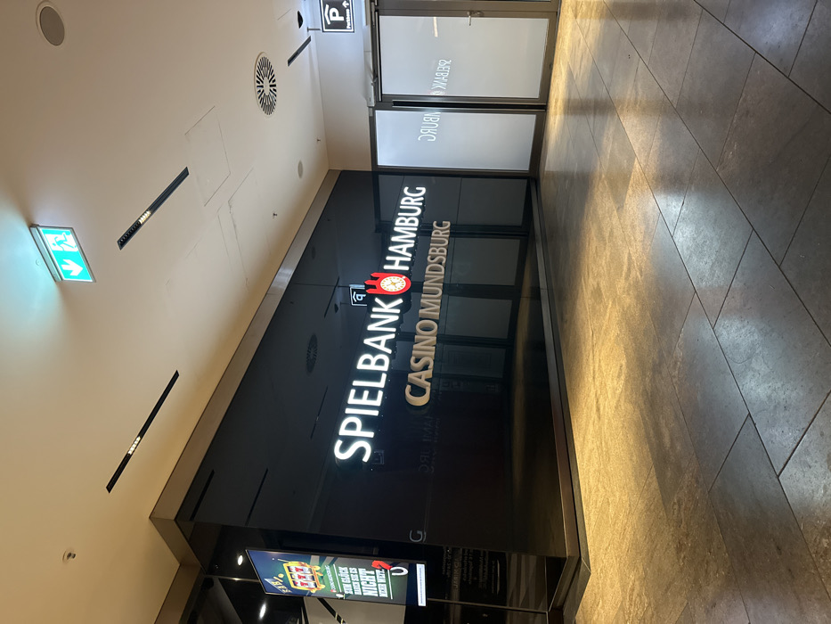 The image depicts the interior of a commercial building, specifically the entrance to the Spielbank Hamburg, Casino Mundsburg, located in Hamburg, Germany