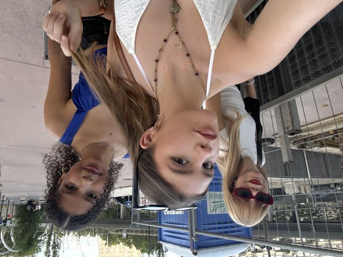 Three women pose close together for a selfie outdoors. The woman on the left wears a blue top and has curly hair. The woman in the center wears a white top with a delicate necklace and has straight brown hair. The woman on the right wears red sunglasses and a white top. A blue portable toilet and a metal fence are visible in the background. The image appears to be rotated 180 degrees.