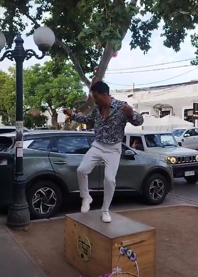 man dancing on a wooden box outdoors. The man is wearing a black and white patterned shirt, white pants, and white shoes. He is smiling as he moves his arms and feet to the rhythm of the music. The box he is standing on is decorated with flowers and a disco ball. Behind him, there are parked cars, a street lamp, a tree, and buildings. The video appears to be taken during the day.