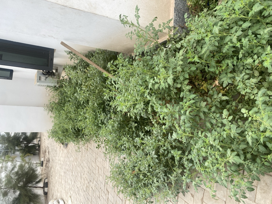 This image depicts an outdoor scene in Nakuse, Nigeria, featuring dense vegetation bordering a paved area and a building. The foreground and midground are dominated by a proliferation of green, leafy plants, consistent with tomato plants, growing in an uncultivated manner. To the immediate right, a light-colored, smooth-textured building wall is visible, on which a weathered outdoor air conditioning unit is mounted. Above the AC unit, two dark-framed windows are partially open or angled. A light-brown wooden stick leans against the wall, partially obscured by the foliage. To the left, a paved pathway constructed from light-colored interlocking bricks extends into the background. Several slender trees with fine, needle-like leaves are visible in the background, some planted within black tires that serve as planters or supports. The scene is illuminated by natural light, indicating daytime. No individuals are present.