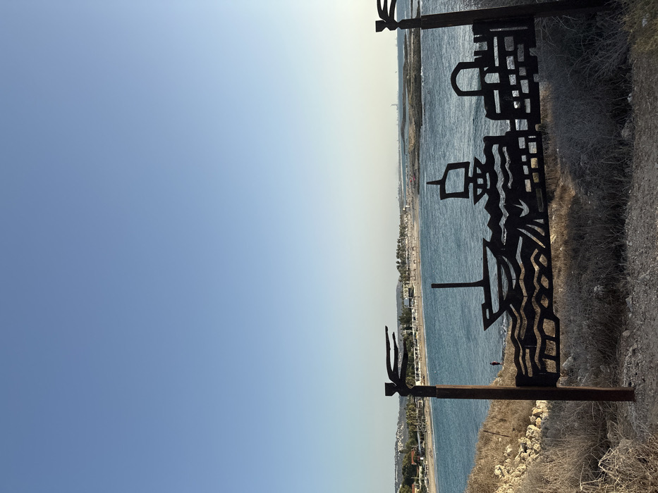 The image depicts a coastal landscape within the Hof HaCarmel Regional Council, Israel, under a clear blue sky. In the immediate foreground, a dark, weathered metal sculpture is prominently displayed. This sculpture features stylized silhouettes: on the left, a horizontal human figure (possibly a diver) emerging from a vertical post; below, undulating wave patterns; two distinct sailing boats on the waves; and on the right, a representation of buildings or a city skyline including arches and rectangular structures. The sculpture is anchored by two vertical posts, each topped with a decorative fin-like element. The ground in the foreground consists of dry, sparse, yellowish-brown vegetation and exposed soil. Beyond the sculpture, a body of blue-green water, consistent with the Mediterranean Sea, occupies the midground. The water exhibits surface ripples. To the left, a sandy beach is visible, populated with numerous light-colored beach umbrellas and sun loungers. Behind the beach, a row of low-rise buildings and green foliage line the coastline. A single, small, dark figure of a person stands at the water's edge on the left side of the beach. Towards the right midground, several dark rock formations are partially submerged in the water. The background features a distant coastline receding into the horizon, with faint industrial structures visible on the far right. The upper two-thirds of the image consist of a clear, light blue sky, indicating daylight conditions, possibly late afternoon or early morning, given the soft lighting.