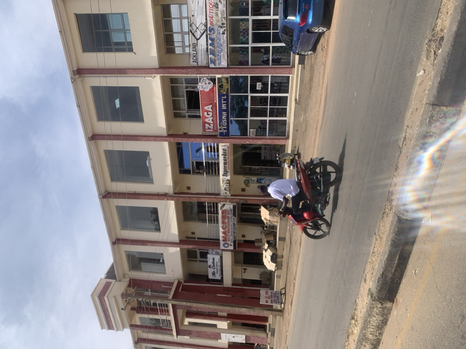 This image presents a daytime street scene in Jos, Nigeria, focusing on a multi-story commercial building with a roadway and sidewalk in the foreground
