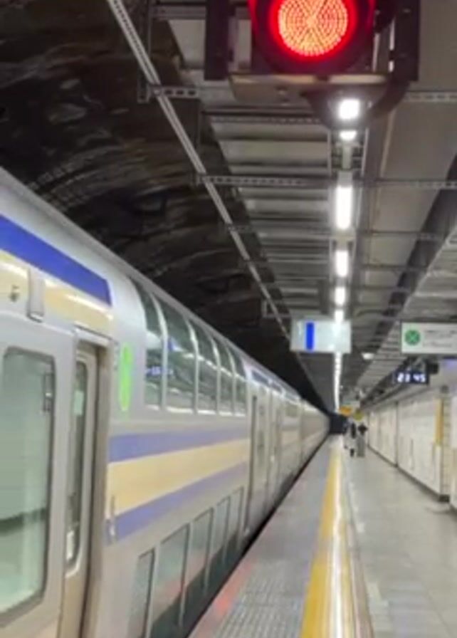 train station platform, with a train stopped alongside. The train is silver with a blue stripe and a green cloverleaf logo. An overhead red traffic light indicates that the train is not clear to proceed. The platform is tiled and has a yellow safety line. Fluorescent lights illuminate the scene. There are a few people waiting on the platform in the distance. The station has a vaulted ceiling that appears to be made of stone.