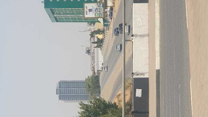 The image displays an urban road scene within the Central Business District of Abuja, Nigeria. The perspective is from an elevated position, looking down upon a multi-lane asphalt road under a hazy, light grey sky. In the immediate foreground, a concrete barrier, painted with alternating black and white segments, and a metal railing are present. The road itself features multiple traffic lanes, delineated by white dashed lines, and appears to ascend towards the background. Seven vehicles are visible on the road, all sedans of varying light and dark colors (e.g., silver, black), suggesting movement or parked status along the thoroughfare. To the far left, a significant cluster of green trees partially obstructs the view. In the mid-ground, on the right side of the road, a large, multi-story building, uniformly painted green, stands prominently. This building is identified as part of the Federal Secretariat complex. A large billboard displaying "MSnel" branding and images of electronic devices is positioned in front of the green building. Behind the main road, several smaller structures with solar panels on their roofs are discernible on both sides. Dominating the far background on the left is a tall, modern high-rise building with a grey, multi-paneled exterior, recognized as the NNPC Towers. No individuals are discernible within the frame. The ambient conditions suggest a dry or dusty atmosphere.