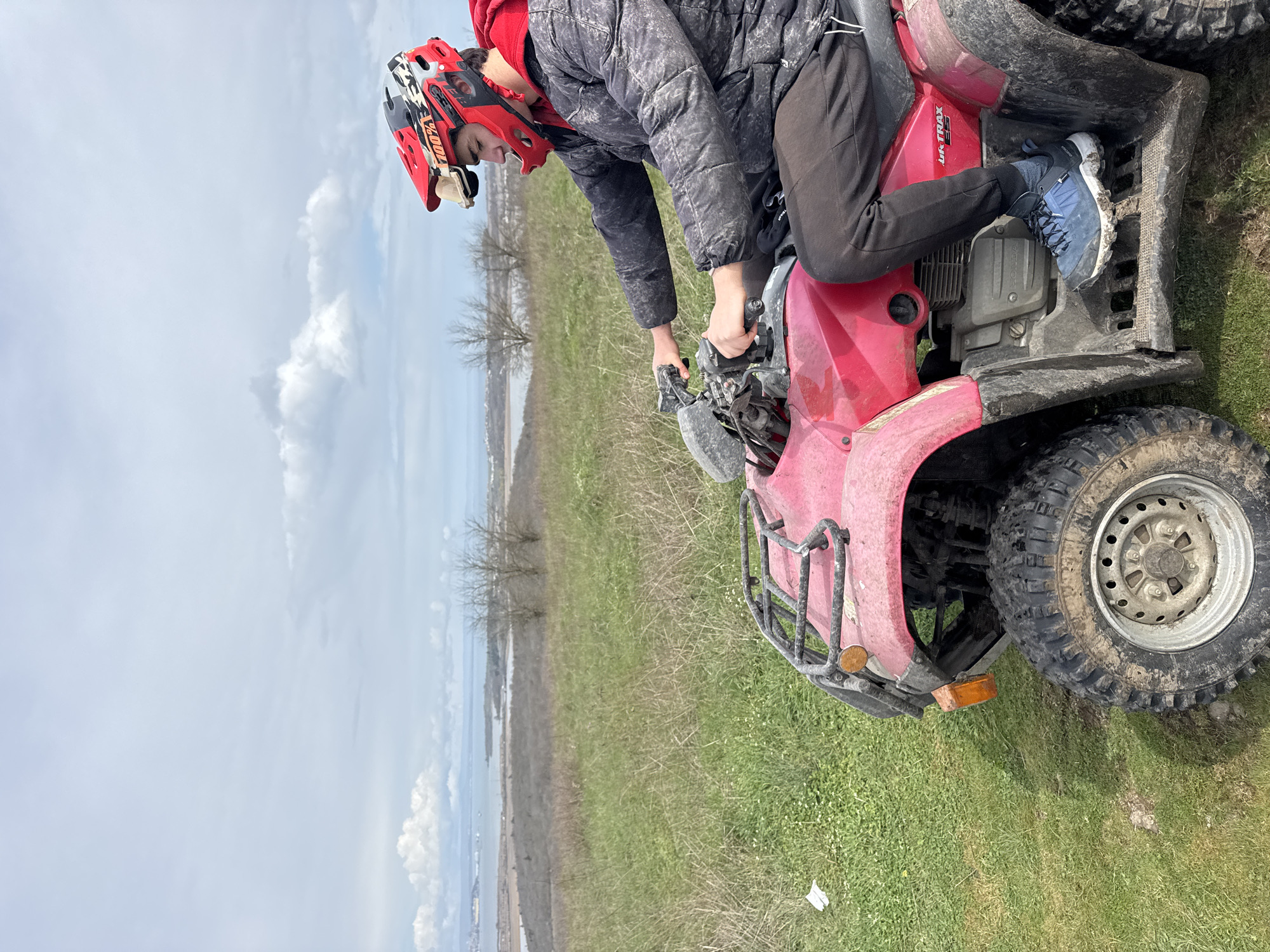 The image depicts a daytime scene on an elevated, grassy slope in Tvarditsa, Bulgaria, overlooking a vast landscape and a large body of water. In the foreground and midground, a male individual, appearing to be a young adult, is seated on a red Honda TRX ATV. He is wearing a red, black, and white full-face motocross helmet with "100%" branding prominently displayed on the visor, a dark grey puffer jacket over a red hooded garment, black sweatpants, and blue hiking shoes with white soles. His hands are positioned on the ATV's handlebars, suggesting he is either operating or preparing to operate the vehicle. The ATV itself is red, with a front cargo rack, visible engine components, and muddy tires mounted on silver-colored rims. Amber turn signals are visible on the front fenders. To the immediate left of the ATV, on the grassy ground, a piece of white debris, possibly paper, is present. The immediate environment is an uneven grassy terrain with patches of dirt. Beyond this, the landscape descends through sparsely vegetated hills with leafless trees into a wide body of water, resembling a sea or large estuary. Distant landmasses, along with faint industrial or urban structures and what appear to be ships, are visible on the far horizon. The sky is largely overcast with scattered grey and white clouds.