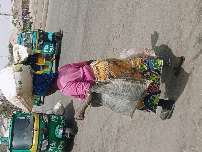 An adult woman is depicted walking on a paved road in Kadoma, Zimbabwe