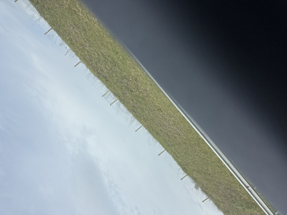 The scene depicts a roadside view in Yazdach, Bulgaria, captured at an oblique angle from what appears to be a moving vehicle. The lower right portion of the image is dominated by a dark, featureless surface, consistent with a vehicle's dashboard or door panel. A light-colored strip, possibly a guardrail or window edge, runs diagonally across the middle, separating the dark foreground from the outdoor environment. Above this strip, a grassy embankment slopes upwards from the lower left to the upper right. The embankment is covered in a mix of green and dry, brownish grass. Along the crest of the embankment, a fence is visible, composed of light-colored wooden posts spaced at regular intervals, supporting a wire mesh barrier. Above the embankment and fence, the sky is partially visible, showing a light blue hue with scattered white and grey clouds, indicative of an overcast or partially cloudy day. No individuals, specific actions, or direct interactions are discernible within the frame.