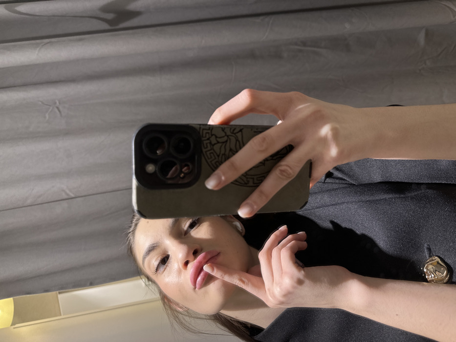A person takes a selfie in a mirror, holding a smartphone with a green phone case featuring a dark Greek pattern. The person's hand and part of the arm holding the phone are visible. The face is partially shown, with a focus on the full lips. The person is wearing a black blazer with a gold ornamental pin. The background includes grey curtains and a white shelf. The lighting is soft and natural.