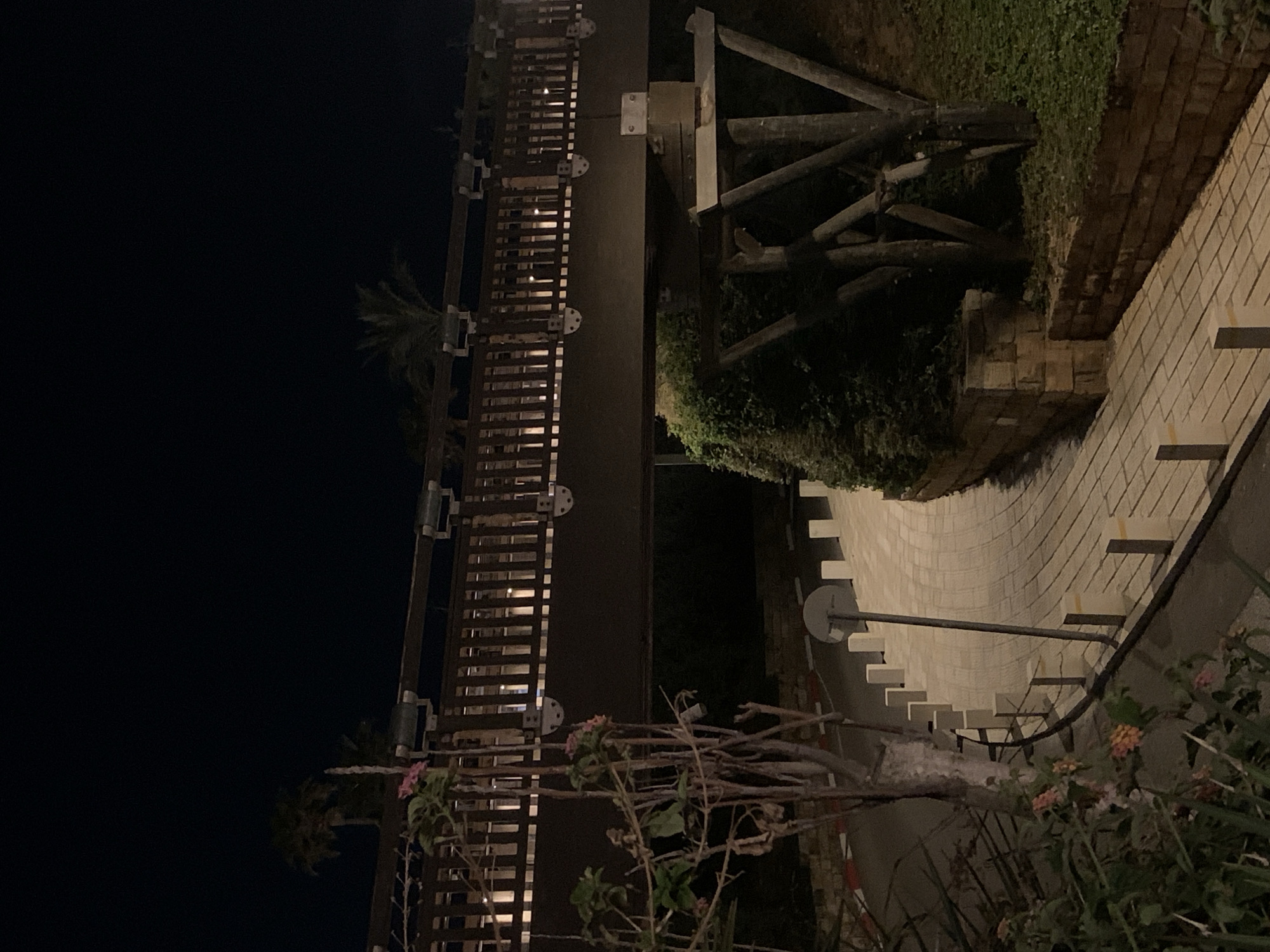 The image depicts a night scene in Tel Aviv, Israel, likely a public area like a park or promenade. A wooden pergola structure stretches from left to right, with evenly spaced vertical slats and metal connectors. Behind it, dense foliage and a few palm trees are visible against the dark night sky. To the right of the pergola, there's a low brick wall. A winding staircase with prominent white steps extends along the wall, leading upwards and away from the viewer. A metal railing accompanies the staircase. Vegetation, including bushes and flowering plants, grows along the base of the wall and around the staircase. The lighting is dim, with artificial lights illuminating the pergola, staircase, and immediate surroundings. The overall atmosphere is calm and quiet.