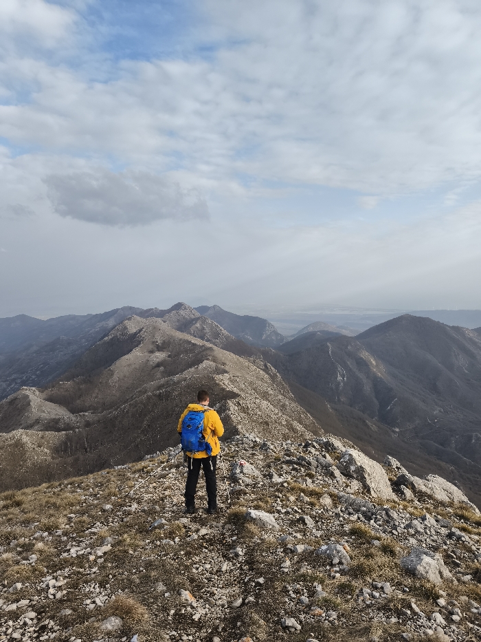 The image displays a solitary male figure standing on a rocky mountain ridge, facing away from the viewer, in the vicinity of Mali Mikulići, Montenegro. The individual wears a bright yellow jacket, black trousers, and a blue backpack, and appears to be utilizing trekking poles. He is positioned on a rugged, uneven surface composed of grey and white rocks and sparse, dry brown grass. A red and white trail marker is visible on a rock to the right of the figure. The background reveals a vast panorama of undulating mountain ridges and peaks, characterized by dark, sparse vegetation and exposed rock, receding into an atmospheric haze. The sky transitions from a partly cloudy blue with scattered white cumulus clouds in the upper portion to a hazy, lighter tone near the distant horizon, which appears to feature a flatter landmass or water body. The overall scene is illuminated by diffuse daylight.