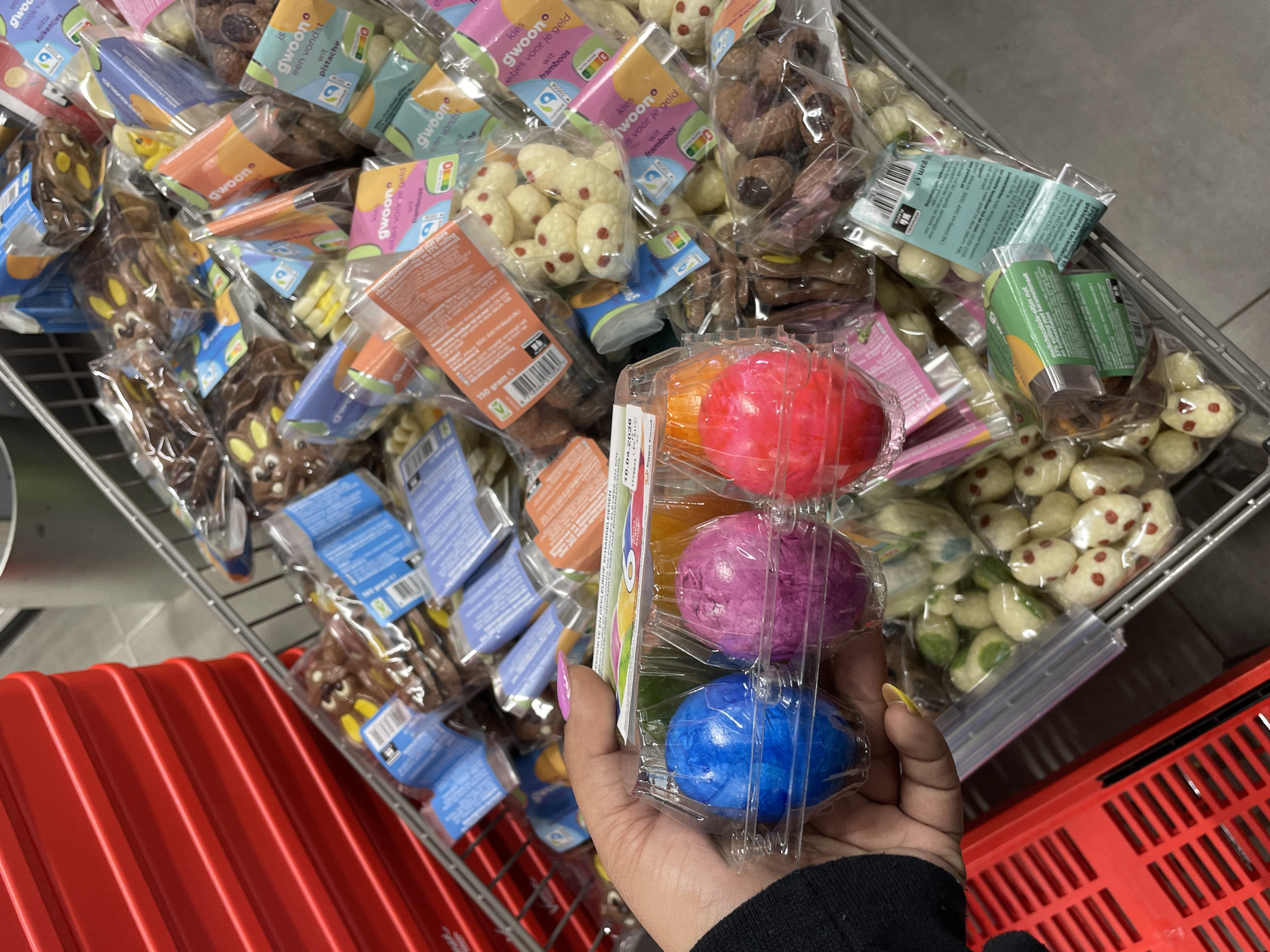 Here is a detailed description of the image: The image depicts a hand holding a clear plastic package containing three dyed eggs - red, purple, and blue - against the background of a shopping cart filled with various bags of "gwoon" brand chocolates. The chocolates are packaged in clear plastic bags and appear to come in several varieties, including white chocolate chicks, pistache and raspberry flavors. There are Fairtrade logos on the packaging. The shopping cart has a red plastic basket and a metal frame. The overall setting appears to be a supermarket in Dronten, Netherlands, where "gwoon" is a commonly found private label brand owned by Detailresult Groep.