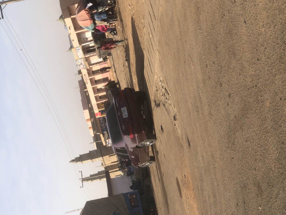 The scene depicts an active, sunlit street in Tukur Tukur, Nigeria. In the foreground, a dark red (maroon) Mercedes-Benz C230 sedan, license plate "ABC 195AV," is angled on a weathered, light brown road surface, showing visible potholes and a textured concrete/metal grate to its right. To the left, a blue truck with a tan canvas cover is parked. Two prominent, light-colored minaret-like structures rise in the mid-distance on the left, accompanied by utility poles and overhead lines. The background features a row of single-story commercial buildings with peach/pink facades and some blue trim, lining the street. A sign bearing "UCHE" is visible on one building. Further right, an open-air market area is present, indicated by an orange parasol sheltering vendors and goods. Several people are visible: one individual walks towards the right foreground with a walking stick, casting a distinct shadow. Others are gathered around the market stall under the parasol. A person in light-colored attire is visible near a partially obscured white pickup truck (possibly a Ford) in the background on the right. The sky is a pale blue, suggesting clear conditions, with shadows indicating either mid-morning or late afternoon.