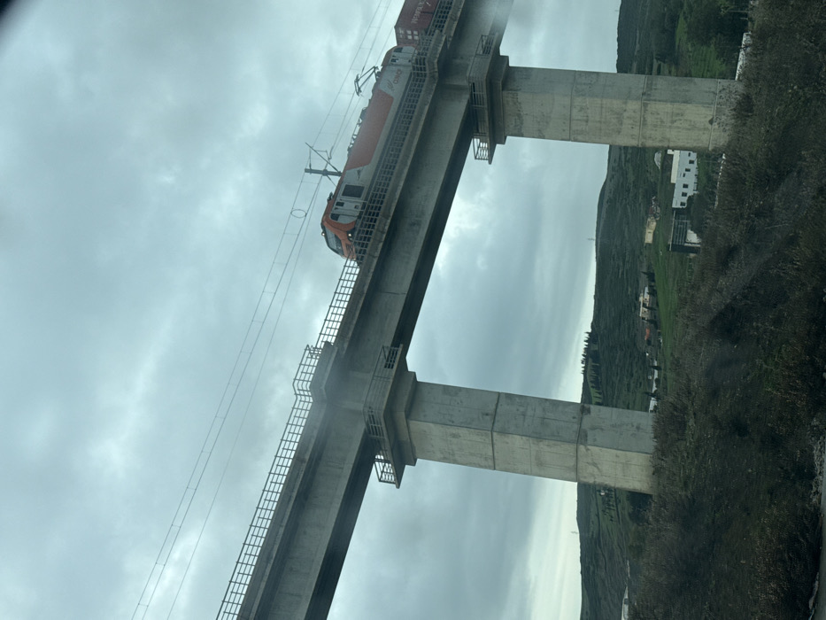 The image displays a concrete railway viaduct spanning a verdant, hilly landscape under an overcast sky in Al Bahraoyine, Morocco