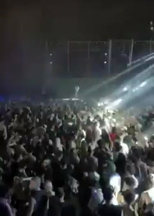 concert with a performer on stage in front of a large crowd. The stage has a bright white background and spotlights shining down on the artist. The crowd is dense and mostly dark, with some people raising their hands and holding up their phones. There is smoke or haze in the air. The overall atmosphere seems energetic and lively.