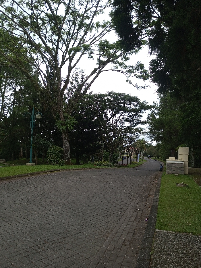 A paved road curves through a green landscape, lined with tall trees. A vintage street lamp stands beside the road. On the right, stacked concrete blocks border the road. Two vehicles are visible further down the road, one possibly a motorcycle. The scene suggests a park or residential area. The sky is overcast.