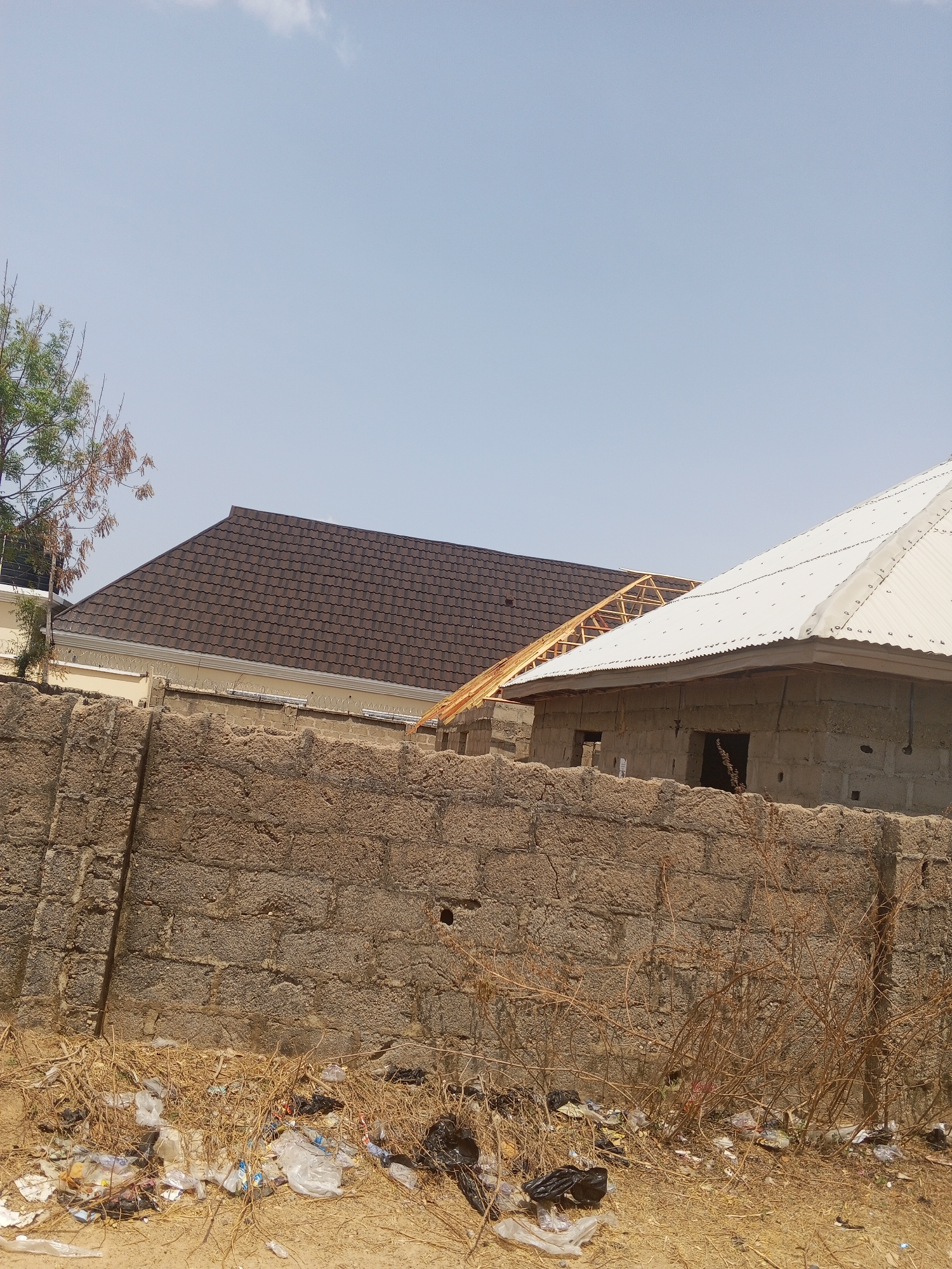 The image depicts a partially constructed building in Adonkolo, Nigeria. The building is constructed of cinder blocks and has a white corrugated metal roof. A second building with a brown tile roof is visible behind the first. A wooden framework is visible on the second building, likely for the roof. A concrete block wall stands in front of the buildings. The ground in front of the wall is dry and littered with trash. The sky is clear and blue. There are no people visible in the scene. A small tree is in the left corner.