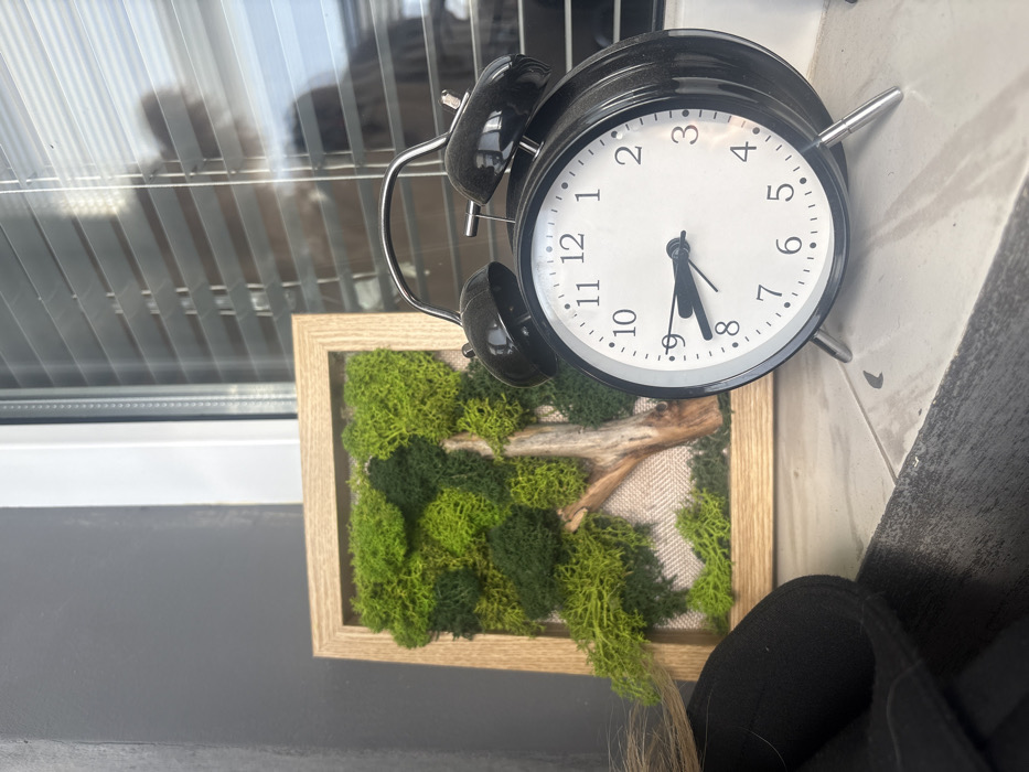 The image depicts an indoor scene in Sofia, Bulgaria, featuring a black, twin-bell analog alarm clock and a framed moss art piece positioned on a light-colored, patterned surface
