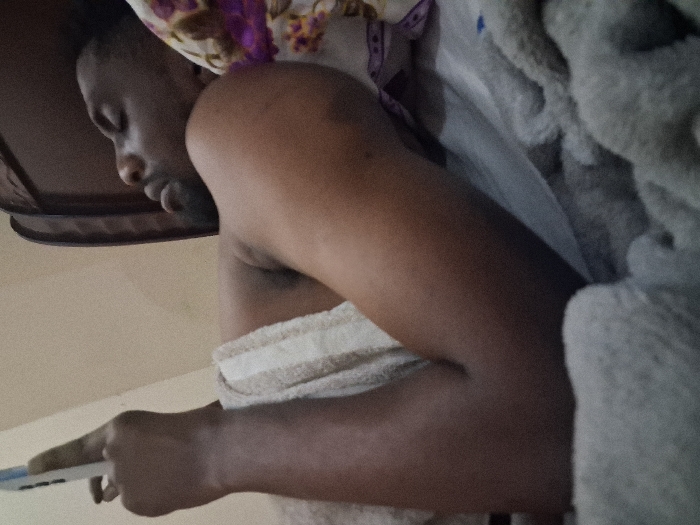 A dark-skinned person lies sideways in bed. The person's eyes are closed. A colorful floral head covering is visible near their head. A light-colored towel or wrap is draped across their body. Their arm is extended, and they hold a rectangular device, possibly a phone, in their hand. A thick, soft, grey blanket is partially covering them. The background shows a plain wall.