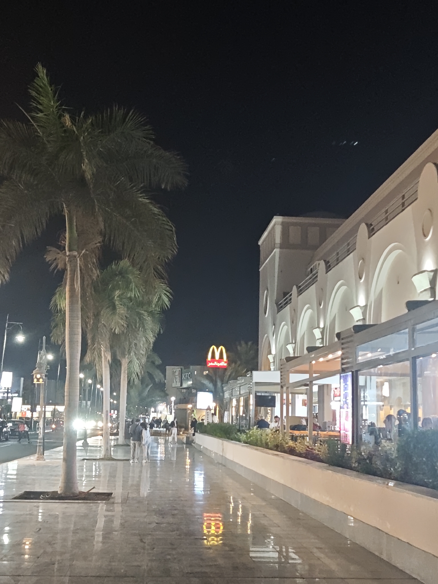 Night shot in Hurghada, Egypt. Illuminated by street lights and neon signs from businesses, people stroll down a wet, paved sidewalk. On the left, palm trees line the street. In the background, a McDonald's and a KFC are visible. On the right, an illuminated building with arches, possibly a shopping center or restaurant, has outdoor seating areas.