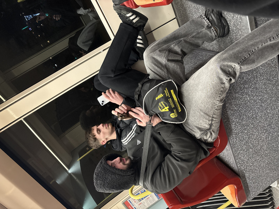 Three people sit on a train. One wears a black jacket with Adidas stripes and a fuzzy grey hood. He has a black shoulder bag. Another holds a white phone and a smaller item. His jacket also has Adidas stripes. One passenger's black Adidas shoes are visible, while another's grey jeans are visible as they sit on the seat. The window reflects a building.