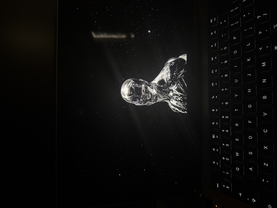 The image depicts an open laptop within a dimly lit environment in the city of Sevlievo, Bulgaria. The laptop screen, occupying the upper portion of the frame, displays a digital render of a human-like bust. This bust is rendered in a highly reflective, liquid-metal-like texture, exhibiting defined musculature, and is positioned facing slightly to the right of the screen's center against a dark, simulated starry background. A distinct diagonal light beam originates from the upper right of the screen's display, casting illumination across the metallic figure. A faint, vertical, rectangular reflection of an external light source is observable on the right edge of the screen. The lower section of the image features the laptop's QWERTY keyboard, which is actively backlit with white light. No individuals or direct human interaction are visible.