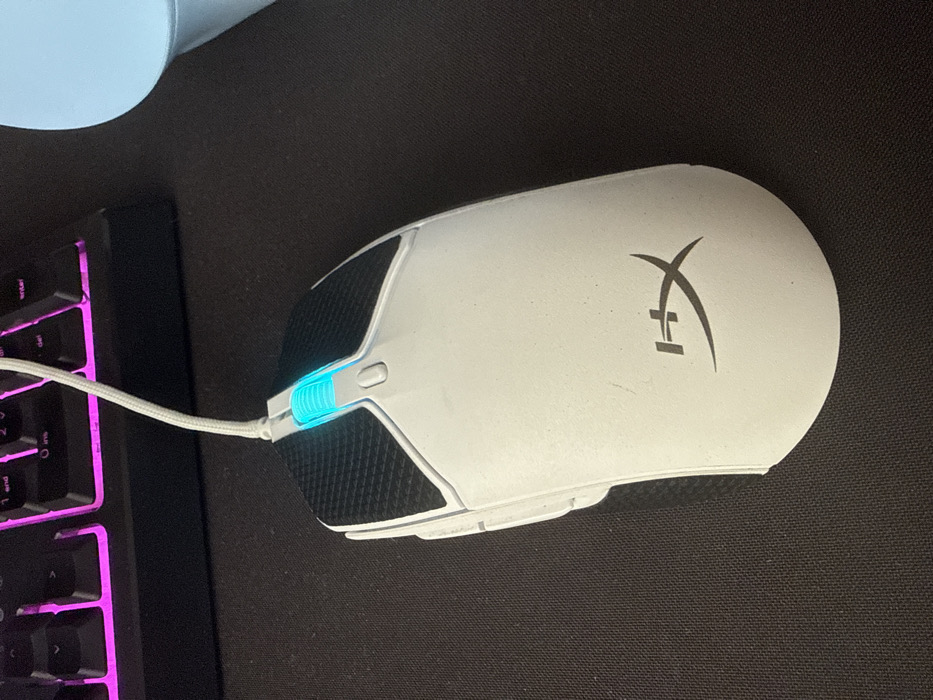 A white wired HyperX computer mouse is centrally positioned on a dark, textured mouse pad. The mouse features black textured grip areas on its left and right click buttons, a light-blue illuminated scroll wheel, and a small grey button located directly behind the scroll wheel. A white braided cable extends from the front of the mouse. The white surface of the mouse displays visible dust particles and minor scuff marks. In the upper background, a section of a black mechanical keyboard is visible, exhibiting pink LED backlighting on several keys. To the upper right, a light blue, out-of-focus object with a rounded form is partially visible. The scene is located in Sofia, Bulgaria.