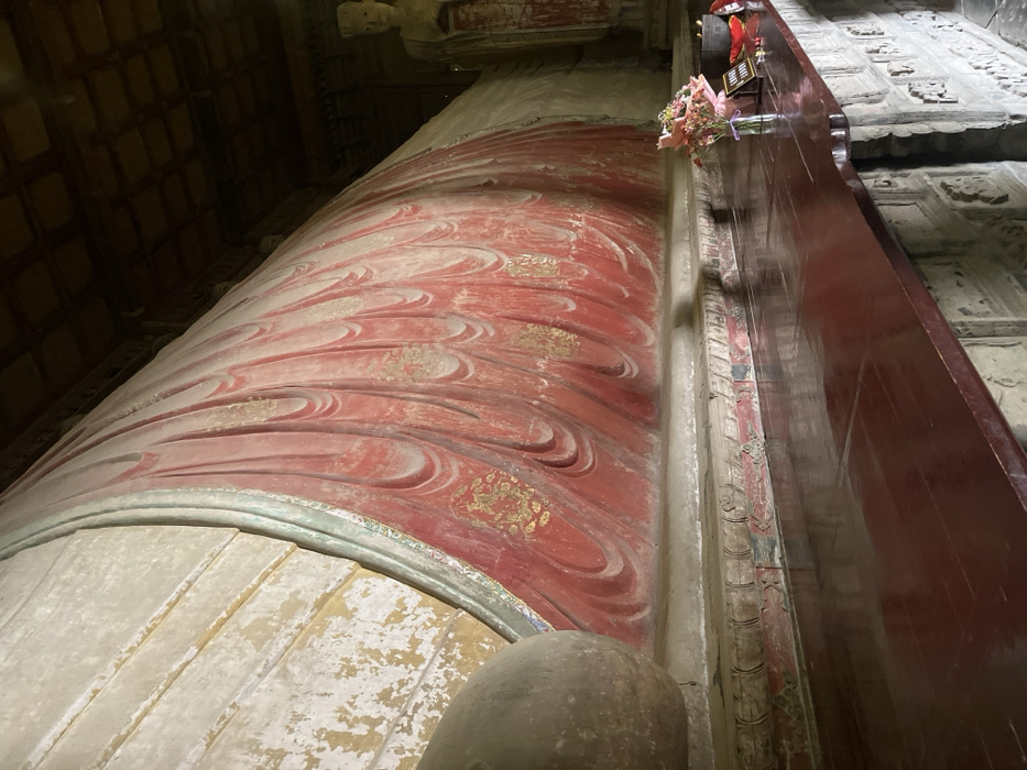 The image depicts a large, polychrome reclining Buddha statue within the Giant Buddha Temple (Dafo Temple) in Zhangye, China. The statue occupies the majority of the frame, positioned diagonally from the lower left to the upper right. The Buddha is seen from its left side, adorned in deeply folded, faded red robes with remnants of gilded patterns, resting on a beige base. The upper part of the statue near the head, partially obscured on the far left, is a lighter beige with a teal-colored trim. In the foreground, a highly polished, dark red wooden altar or platform runs horizontally, reflecting the scene above. Below this platform, a stone or brick wall features carved relief details. On the platform, in the lower right, offerings are visible: a small glass vase holding a bouquet of pink, white, and yellow flowers, wrapped in light purple material; a small, dark rectangular sign; and further right, a dark, shallow bowl along with several small, red objects. The background on the far right reveals a standing figure statue, primarily beige with some red elements, positioned next to the reclining Buddha. The ceiling overhead is dark and appears to be coffered or paneled with wood. The overall lighting is subdued, suggesting an indoor temple environment. No individuals are present in the scene.