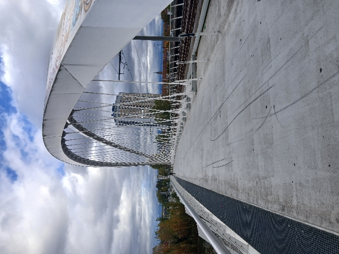 The image depicts the Pont Beatus Rhenanus, a white arched cable-stayed bridge connecting Kehl, Germany, with Strasbourg, France, spanning the Rhine River. The perspective is from the Kehl side, looking towards France. The bridge features a wide, light-grey concrete deck with prominent tire scuff marks from bicycles or similar small vehicles. On the far left, a metal grate drainage channel runs alongside a two-bar metal railing. The main structural element is a large, white, hollow-box arch, from which numerous thin metal suspender cables descend vertically to support the deck. The inner surface of the arch structure shows faint, colorful graphical elements. To the right of the pedestrian/cyclist path, a set of tram tracks is visible, accompanied by overhead catenary support structures and wiring. In the mid-ground, a single, indistinct individual is visible walking on the bridge deck near the left railing, moving away from the viewer. The surrounding environment includes a body of water (likely the Rhine River or a connected canal) to the far left, bordered by deciduous trees displaying autumnal yellow and orange foliage. The sky is partially cloudy with significant grey cloud cover, but patches of blue sky are visible. In the background, a tall, multi-story, modern building with a dark top section stands prominently. Further in the distance, to the right, a slender, dark spire of a building is silhouetted against the sky, typical of a church or historic structure.