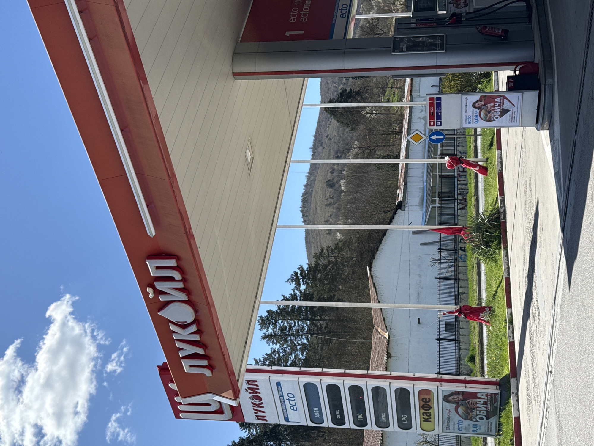 This is an outdoor shot of a Lukoil gas station in the city of Balgarski Izvor, Bulgaria, displaying several notable details