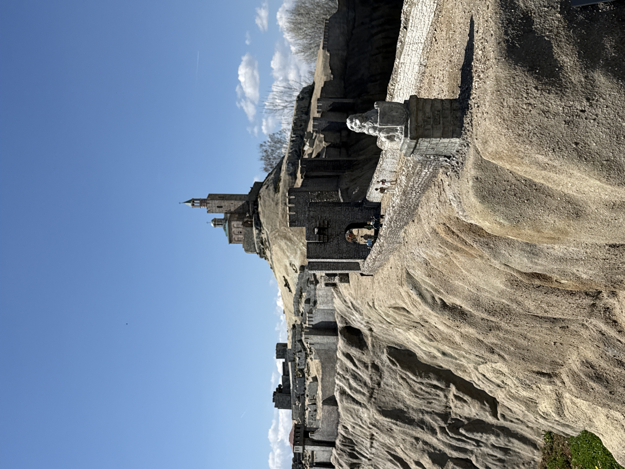 miniature replica of a medieval castle atop a rocky hillside against a clear blue sky with some clouds