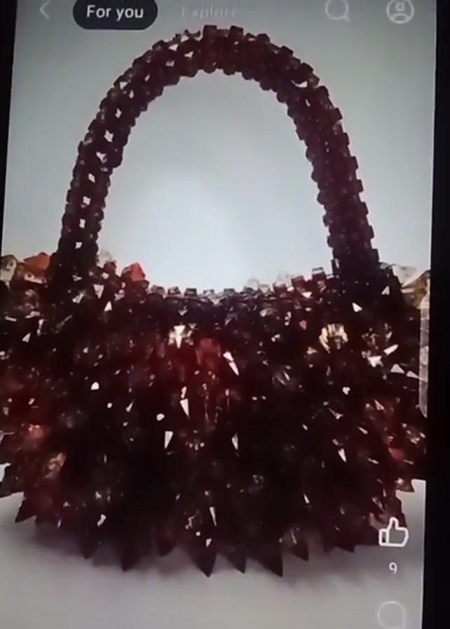 A phone screen shows a TikTok video of various beaded bags. The first is a dark red beaded bag with pointed beads sticking out all over. The second is the same bag in a black pot. The third is a beaded bag made of a variety of colorful beads. The video is playing on a phone.