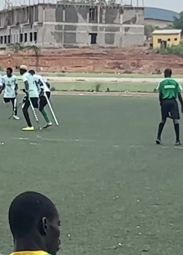 soccer game taking place on a green field. Most of the players appear to be using crutches for mobility. One player kicks the ball while using crutches. Another player in a green shirt appears to be a referee. Two people are visible in the foreground watching the game. In the background, there are buildings under construction and some smaller completed buildings. The weather appears to be overcast.