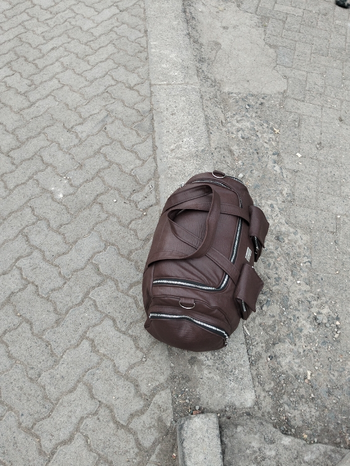 A brown leather duffel bag rests on a grey curb and adjacent cobblestone sidewalk. The bag features several zippered compartments and carrying handles. The curb separates the cobblestone from a concrete surface with scattered debris. The bag is positioned at an angle, taking up a significant portion of the right side of the frame.