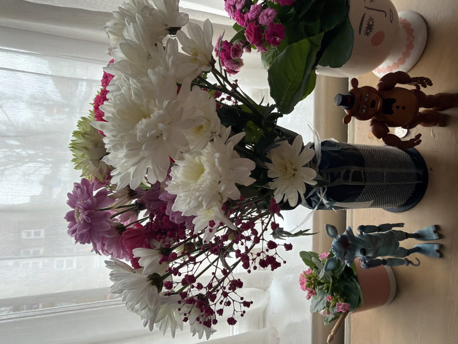 This image captures an indoor scene, likely a residential windowsill or shelf, with several objects arranged on a light-colored wooden surface in front of a window. Through partially drawn sheer white curtains, a blurred background reveals brick buildings and leafless trees, consistent with a residential area within London, United Kingdom. A large mixed floral bouquet, consisting primarily of white and purple chrysanthemums along with small pink filler flowers, is centrally placed in a dark, textured cylindrical vase. To the left of the vase, a small potted plant with pink flowers sits in a pink pot. Adjacent to this plant stands a blue-grey action figure resembling Foxy from "Five Nights at Freddy's," featuring a hook on its right arm. To the right of the central vase, a brown action figure resembling Freddy Fazbear from "Five Nights at Freddy's," complete with a top hat and bowtie, is positioned upright. Further to the right, another potted plant with bright pink flowers is contained within a white, decorative pot adorned with a stylized facial design. Natural light from the window illuminates the scene, suggesting an overcast day.