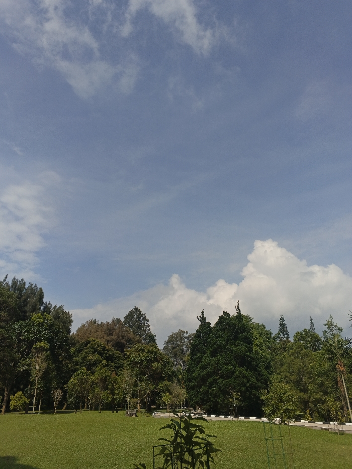 A vibrant green lawn stretches out towards a line of dense trees under a bright blue sky. Fluffy white clouds dot the sky, adding depth to the scene. The trees vary in height and shade, creating a natural backdrop. A hint of a paved path is visible along the edge of the lawn, offering a subtle structure to the otherwise organic environment.