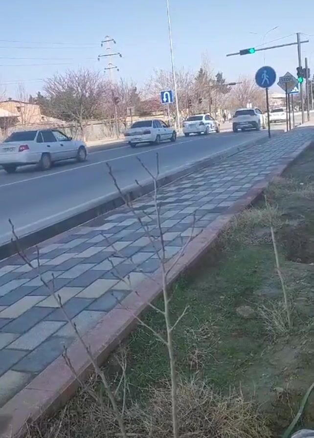 road with several cars and a motorbike driving on it. The road has a sidewalk made of grey and light blue tiles. On the right side of the sidewalk, there is a grassy area with some small bushes. The sky is clear and blue. The traffic light in the distance is green. There are several road signs visible, including a pedestrian crossing sign and a U-turn sign. The video is taken from a stationary position, slightly obscured by a small shrub in the foreground.