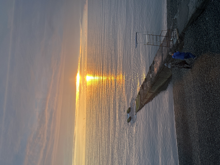 This image depicts a coastal scene in Sochi, Russia, at either sunrise or sunset. The sun, a bright orange-yellow orb, is low on the horizon, casting a strong, shimmering reflection across the calm, dark blue-gray water of the Black Sea. The sky above is a blend of orange, yellow, and blue-gray with horizontal cloud formations. In the foreground and extending into the mid-ground from the left, a weathered concrete pier or breakwater stretches into the water. Its surface shows patches of moss-like growth. The far end of this structure is partially submerged, with two rectangular concrete blocks visible above the waterline, causing small ripples. To the right of the pier, on a pebbled beach, a metal lifeguard chair with a blue canopy is positioned. Two individuals are present on the pebbled beach adjacent to the concrete pier. One individual, wearing a patterned, possibly hooded garment, walks towards the left. Trailing slightly behind and to their right, a second individual, dressed in a blue jacket and dark headwear, also walks towards the left.