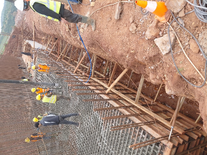 The image depicts an active construction site in Fdalate, Morocco, focused on concrete pouring operations. Approximately eight male workers are present. In the center-left, a large area features a dense steel reinforcement bar (rebar) grid, partially covered with wet concrete. A dark grey concrete pump hose extends from the upper-center, dispensing concrete into this rebar structure. A worker wearing a yellow hard hat and an orange high-visibility vest is operating a concrete vibrator to consolidate the freshly poured material. Other workers, similarly equipped with hard hats and high-visibility vests, are situated on or near the rebar grid, observing or assisting. One worker in a dark jacket stands on the rebar grid without a visible hard hat or vest. Along the right edge of the rebar grid, a wooden formwork structure is erected to contain the concrete. This formwork is braced by angled wooden supports that extend into an excavated trench. The trench, filled with reddish-brown earth, runs parallel to the formwork. The immediate foreground on the right consists of uneven reddish-brown soil containing loose rocks, coiled electrical cables, and a single orange and white traffic cone. A worker wearing a white hard hat, yellow-green high-visibility vest, dark clothing, and green rubber boots stands in the foreground, facing towards the concrete pouring area. In the background, a steep structure made of rebar or previously poured concrete rises on the left, while a sloped, vegetated hillside is visible on the upper right.